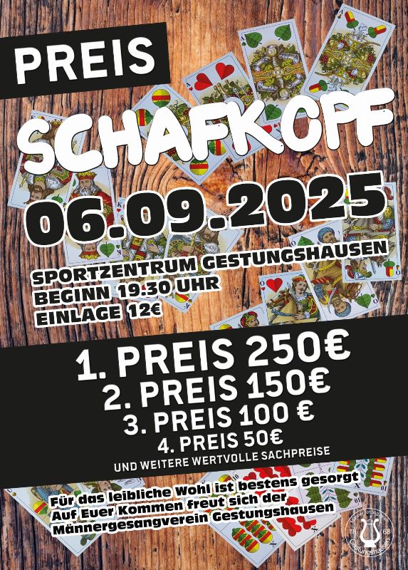 Auch in diesem Jahr freuen wir uns, euch zu unserem traditionellen Preisschafkopf begrüßen zu dürfen. Neben attraktiven Geldpreisen warten wieder zahlreiche hochwertige Sachpreise auf euch.